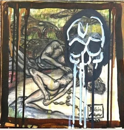 This painting reimagines the birth of water as an act of warlike creation for Ares, god of violent conflict and raw force, but in love Aphrodite. The skull covers his face as he wears his loving mask.