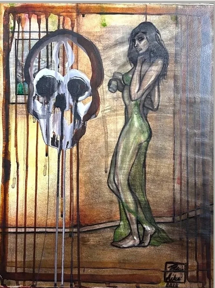 Blackening drips trail from the cup’s edge, falling in slow, deliberate lines that pool on the floor and spread outward across the canvas like spilled ink or wine. The drips stain the ground beneath her feet and creep up the hem of her gown, symbolizing the poison’s inevitable reach: not yet taken, but already beginning to saturate the space. Circe is radiant yet remote—goddess of enchantment, her beauty a lure, her hospitality a trap disguised as generosity.