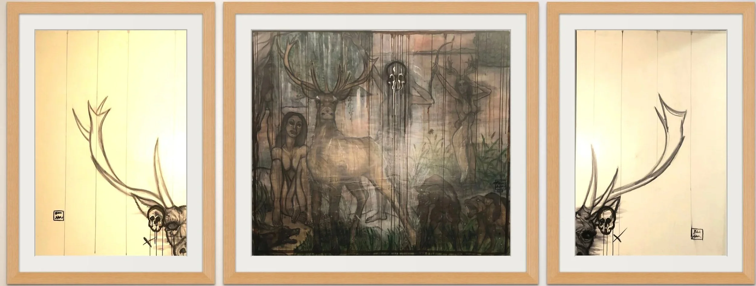 The Death of Actaeon [Dimensions: e.g., 60" x 96" or your actual size] · Carbon pencil, blackening watercolours, and inks on paper mounted to canvas · [Year if known, e.g., 2018–2024]