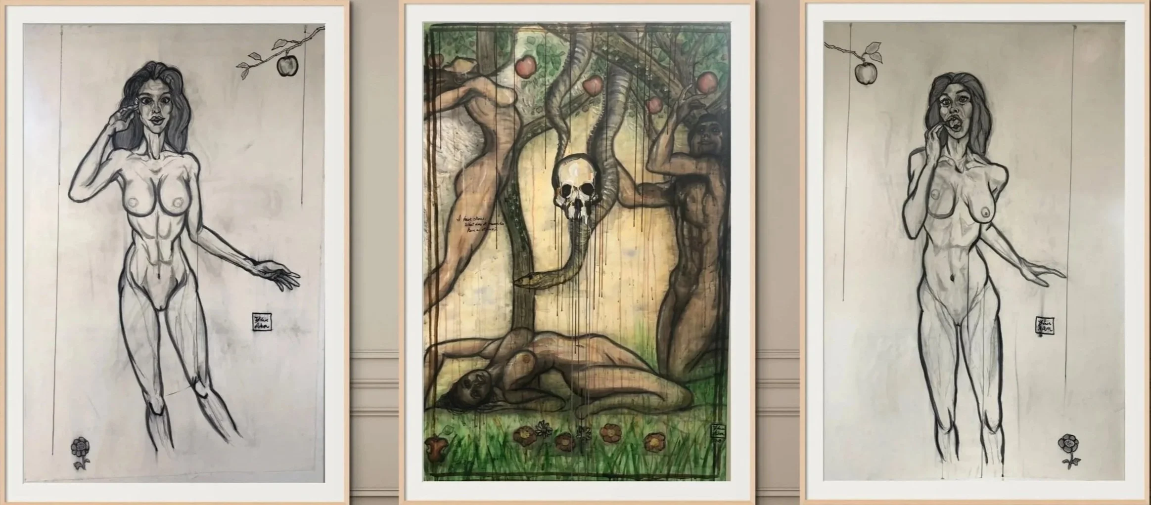 In the central panel, Adam kneels, gaze locked on one of many apples on the Tree of Life — symbols of life’s temptations, which he worships. Opposite him, Eve dances with her own distractions, neither seeing the other nor the looming snake that divides them. The snake bears a skull: its mask removed, embodying raw honesty and truth — we choose not to recognize it, or each other, as life’s static overwhelms us. Inscribed across Eve’s leg: “I have Choice. What does it mean to have Choice?”