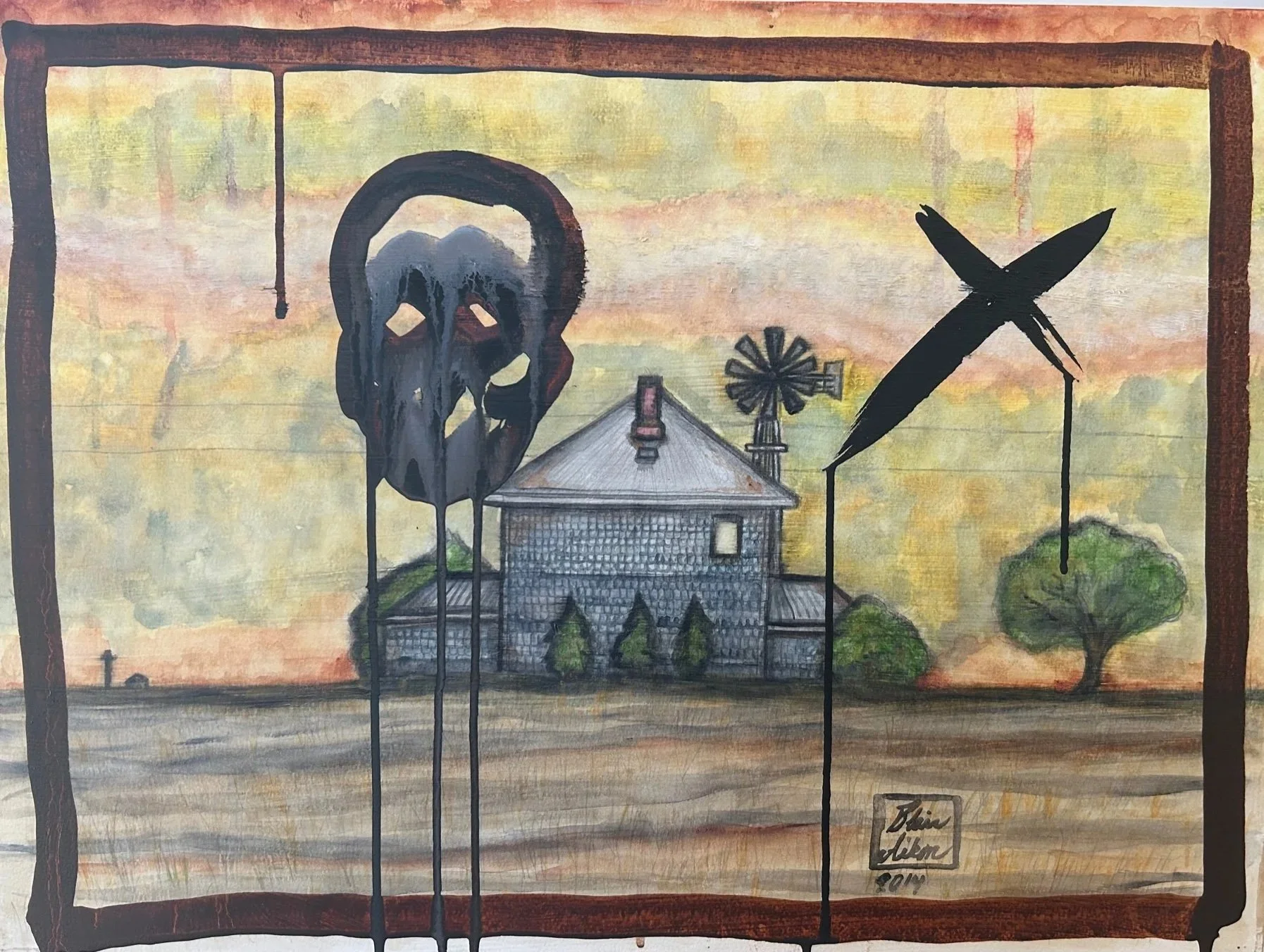 The Farm House [Dimensions: e.g., 36" x 48" or your actual size] · Carbon pencil, blackening watercolours, and inks on paper mounted to canvas · [ 2018–2024]