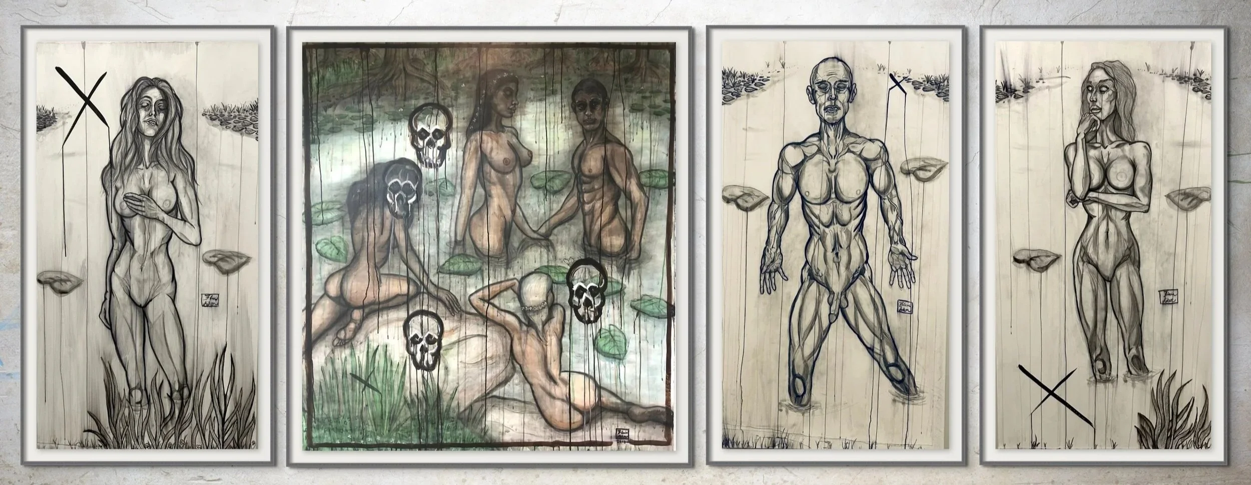Hylas and Nymphes [Dimensions: 48" x 72" or your actual size] · Carbon pencil, blackening watercolours, and inks on paper mounted to canvas · [2019–2025]