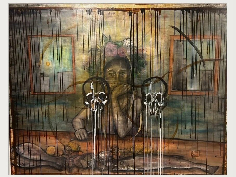 This painting places the inner child seated at a small table that has become a fragile island in a fracturing world. She sits quietly, surrounded by fish and other sea creatures pulled from their environment—some still glistening with water, others already dull and drying on the wooden surface. Fish, shrimp, and other sea creatures lie scattered among half-eaten shells, their once-living forms now still and exposed. The child’s hands rest on the table holding a knife, nearly but not brushing the edge of a fish as if trying to understand what has been taken from the water.