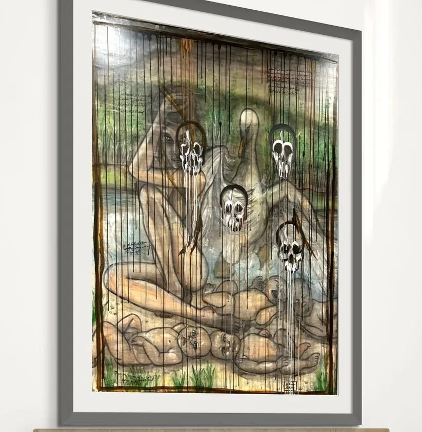 This painting reimagines the myth of Leda and the Swan as an intimate, unsettling encounter. Leda sits on the bank, her body curved in a mix of resistance and surrender, while Zeus in swan form presses close—wings half-spread, neck arched, beak grazing her shoulder. The swan's white feathers contrast sharply with the blackening water that laps at the edge of the scene, drips rising like ink from the river to stain her skin and the feathers themselves.