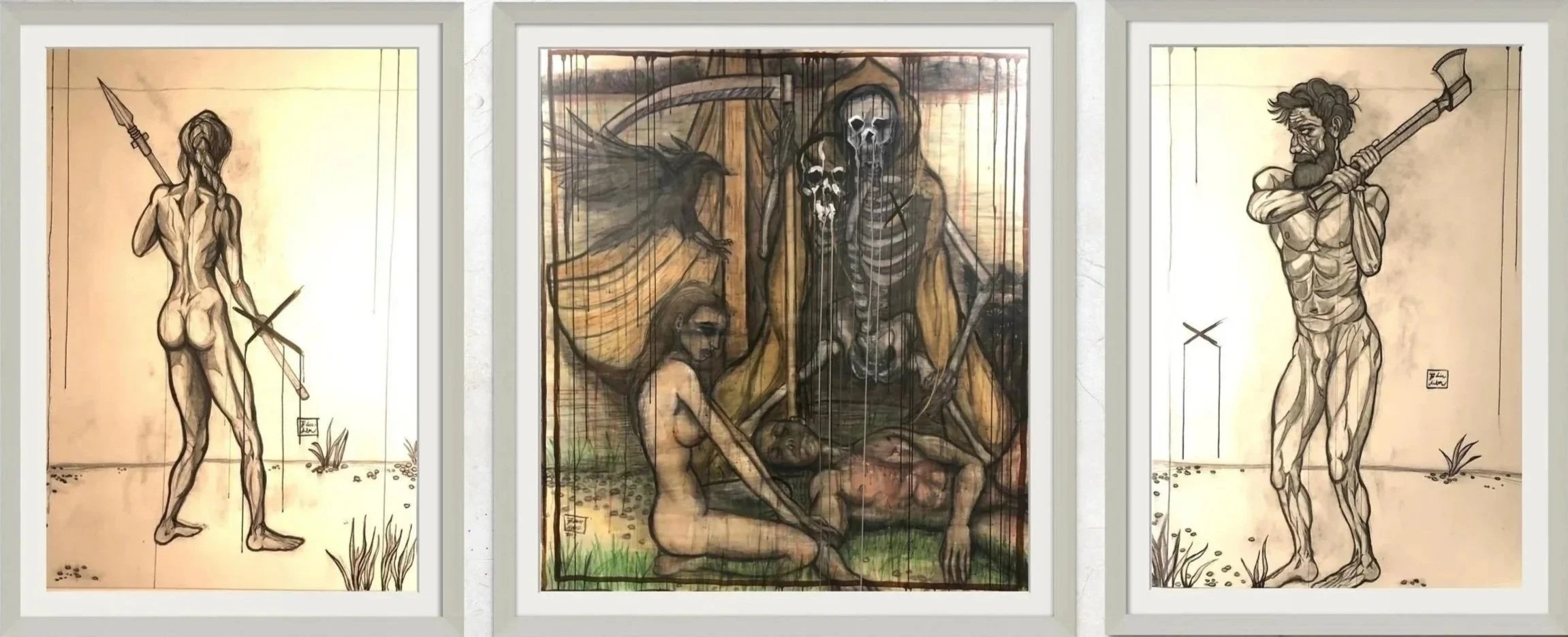 The black-and-white side panels frame the scene like sculptures: on the right, offence embodied by a male figure on his toes, axe raised to strike again, weight forward—his choice to fight sealing the fall into dirt. On the left, defence as a female figure on her heels, spear high but gaze distant—holding position yet unable to act. Both armed, yet the outcome remains unchanged; loss echoes in the survivor.