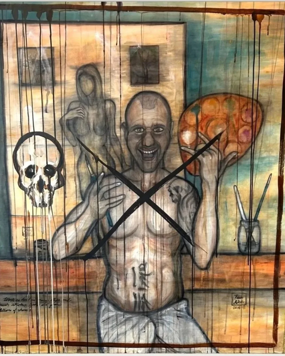 No masks remain here: the unmasked self stares back, scarred and tattooed by 37 years of daily ritual, by survival, by the relentless drive to strip away one layer at a time. The easel becomes the crossroad—where pain meets persistence, where "mistakes" are embraced as the true medium of discovery. The hand holds the brush like a weapon and a lifeline, painting the self into existence even as it dissolves into ink.