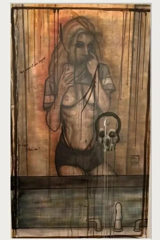 SELFIE/Peitho the Tease ” x ” · Carbon pencil, blackening watercolours, and inks on paper mounted to canvas · [Year if known, e.g., 2021–2025]