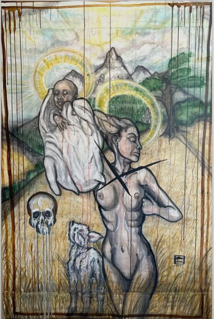 Virgin and Child [Dimensions: 36" x 48" ] · Carbon pencil, blackening watercolours, and inks on paper mounted to canvas · [2017–2024]