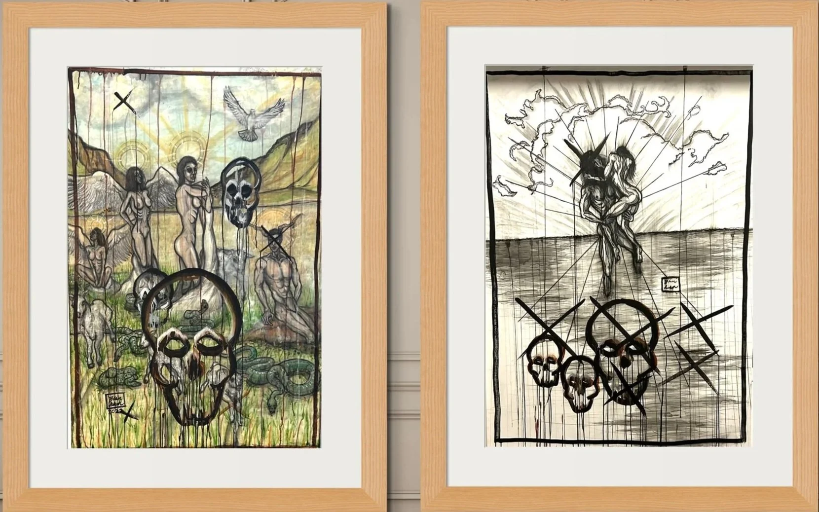 Which Eden Diptych: Two panels, each ” x ” · Carbon pencil, blackening watercolours, and inks on paper mounted to canvas · [2020–2025]